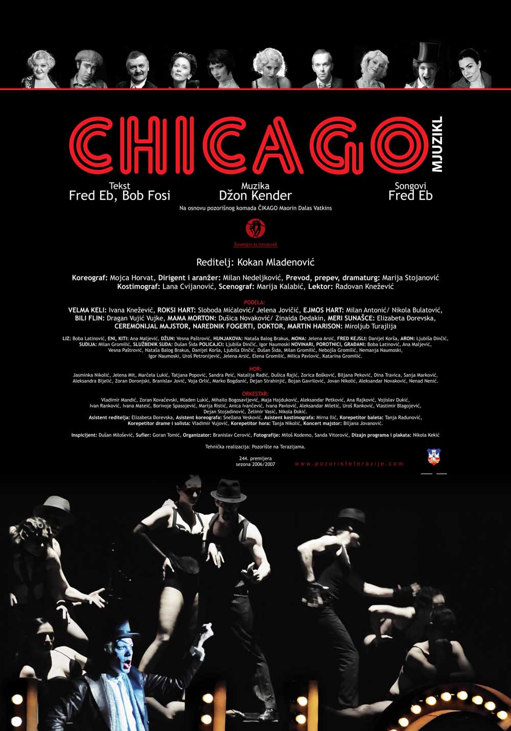 Iz Pozorišta na Terazijama podećaju da je „Čikago“ je jedan od najpopularnijih brodvejskih mjuzikala u kome se prepliću strast, požuda, spletke, ubistva, šou biznis i potkupljive sudije i advokati, a na satiričan način govori o Americi iz vremena burnih dvadesetih godina prošlog veka.