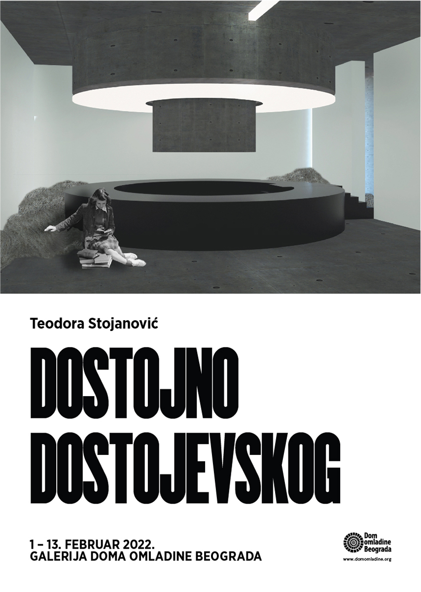 Menjajući mikrolokacije svog bivstvovanja, sužavajući ili šireći svoj životni prostor i otvarajući ili zatvarajući sebe u tom prostoru, čovek pokušava da svet iz sebe prenese u spoljašnjost, da iskustvu, znanju i verovanju stvori pojavni oblik, da ga opredmeti. U izložbi „Dostojno Dostojevskog“ Teodora Stojanović nastoji da svoja verovanja i shvatanja o liku i delu Dostojevskog pretoči u prostor, a lični utisak prenese na posmatrača.