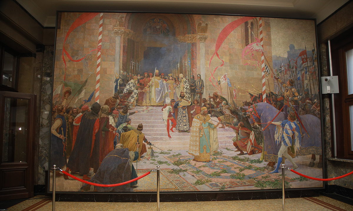 On the occasion of marking the Statehood Day of the Republic of Serbia, the National Museum, after extensive conservation and restoration works, today solemnly presented the monumental work of Paje Jovanovic, Coronation of Emperor Dusan, also known as the