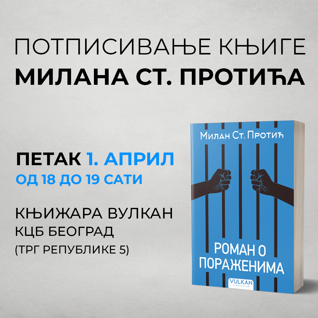U petak, 1. aprila, sa početkom u 18 sati, u knjižari Vulkan KCB (Trg republike broj 5) biće organizovano druženje sa piscem i istoričarom Milanom St. Protićem, kao i potpisivanje njegove knjige Roman o poraženima, koju je objavilo Vulkan izdavaštvo.