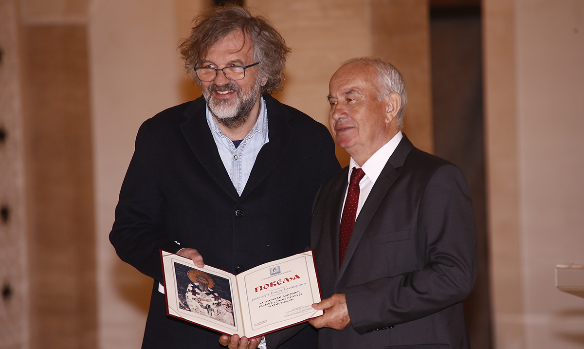 Emir Kusturica je priznanje primio od predsednika „Prosvjete“ Milimira Mučibabića koji je istakao da mu je čast i zadovoljstvo da uruči povelju „najvećem srpskom reditelju“.
