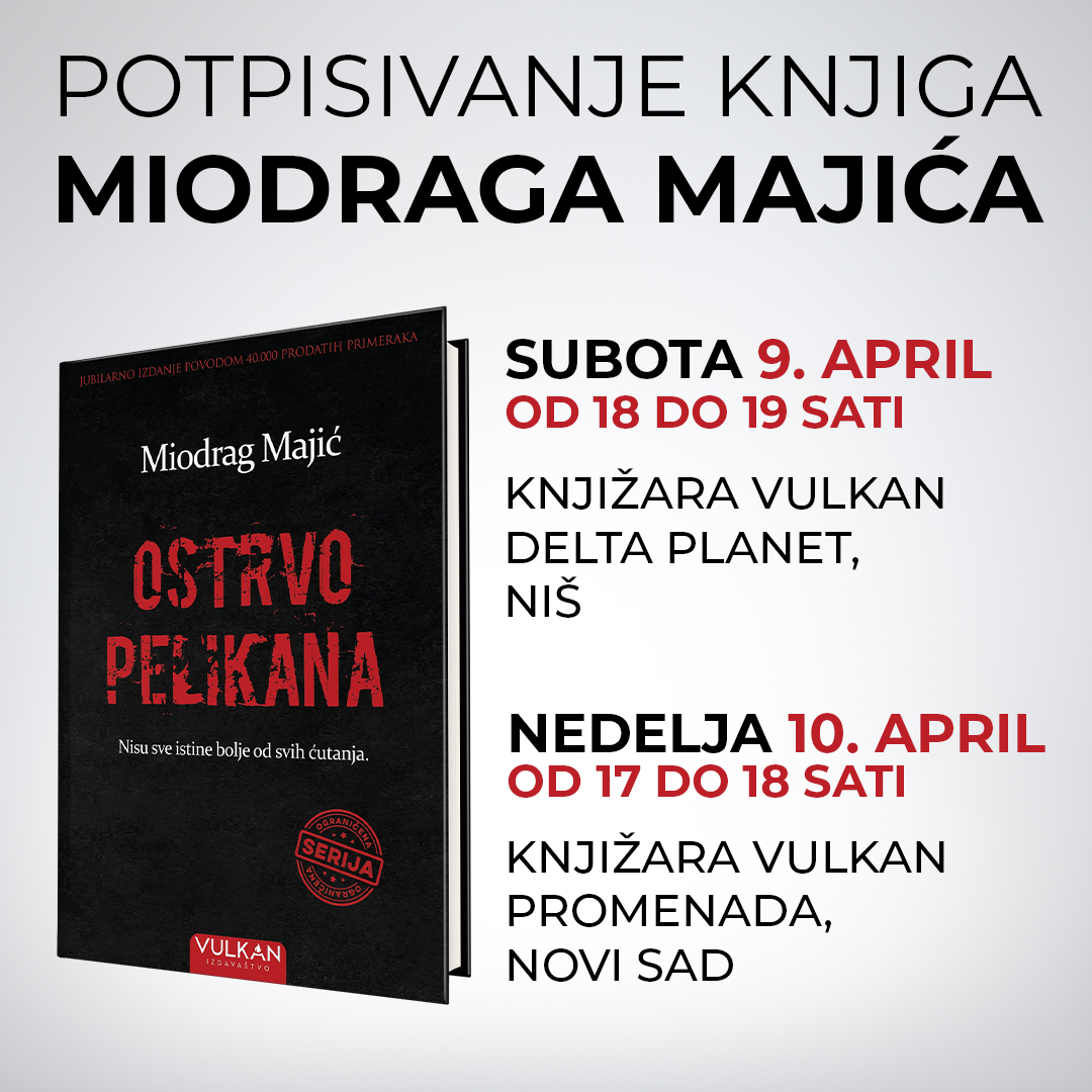 Zbog velikog interesovanja poštovalaca proze Miodraga Majića, autor bestselera Deca zla i izdavačkog fenomena Ostrvo pelikana, prodatog u neverovatnih 40.000 primeraka, zakazao je druženje sa niškom i novosadskom publikom. Potpisivanje knjiga je savršena prilika za čitaoce da ostvare lični kontakt s autorom i da porazgovaraju o romanima koji su izazvali pažnju javnosti u čitavom regionu.