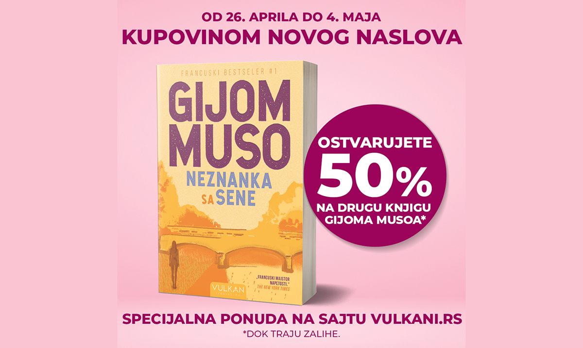 Francuski majstor napetosti obradovao nas je novim trilerom Neznanka sa Sene, a Vulkan izdavaštvo pripremilo je za ljubitelje Musoovih romana fantastičnu akciju. Kupovinom novog bestselera Neznanka sa Sene putem sajta vulkani.rs do 4. maja ostvarujete 50% popusta pri kupovini druge Musoove knjige. Dopunite svoju biblioteku fantastičnim romanima najčitanijeg francuskog pisca!