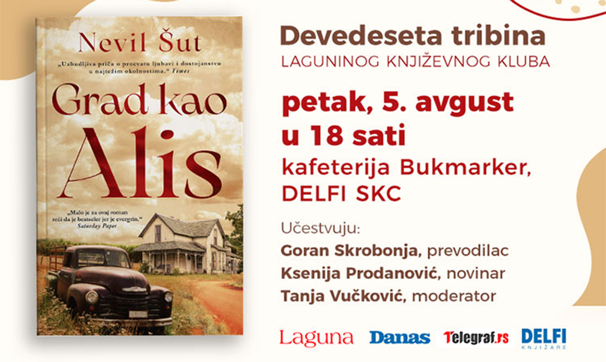 Na jubilarnoj 90. tribini Laguninog književnog kluba, u petak, 5. avgusta od 18 sati u knjižari Delfi SKC razgovaraćemo o istorijsko-ljubavnom romanu „Grad kao Alis“ Nevila Šuta koji je napisao 1950. godine, neposredno nakon što se doselio u Australiju.