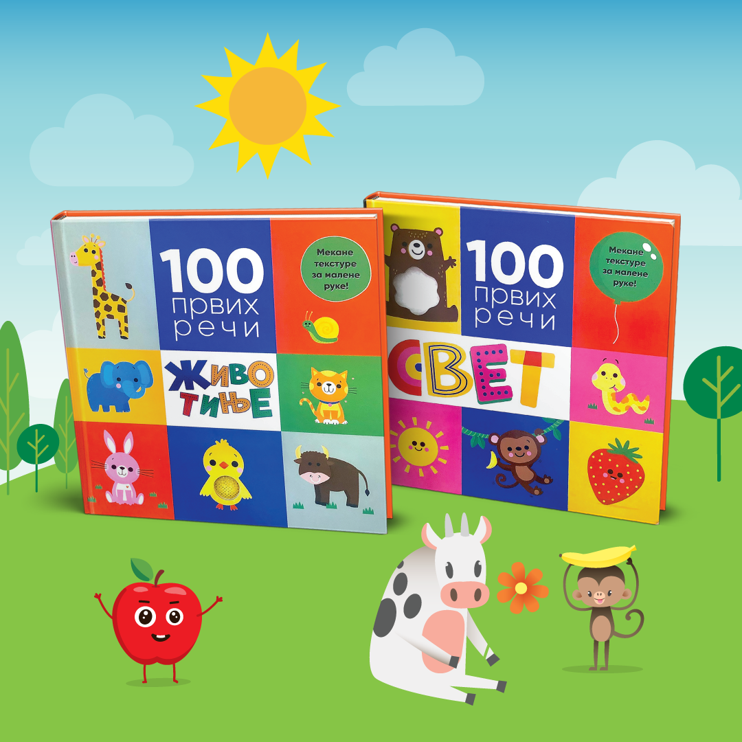 Uz 100 prvih reči: Svet i 100 prvih reči: Životinje mališani će istraživati svet oko nas i pritom bogatiti svoj rečnik. Svaka knjiga sadrži 100 reči koje će mališani kroz igru naučiti, ali i mekane teksture, koje dodatno pospešuju učenje na interesantan način.