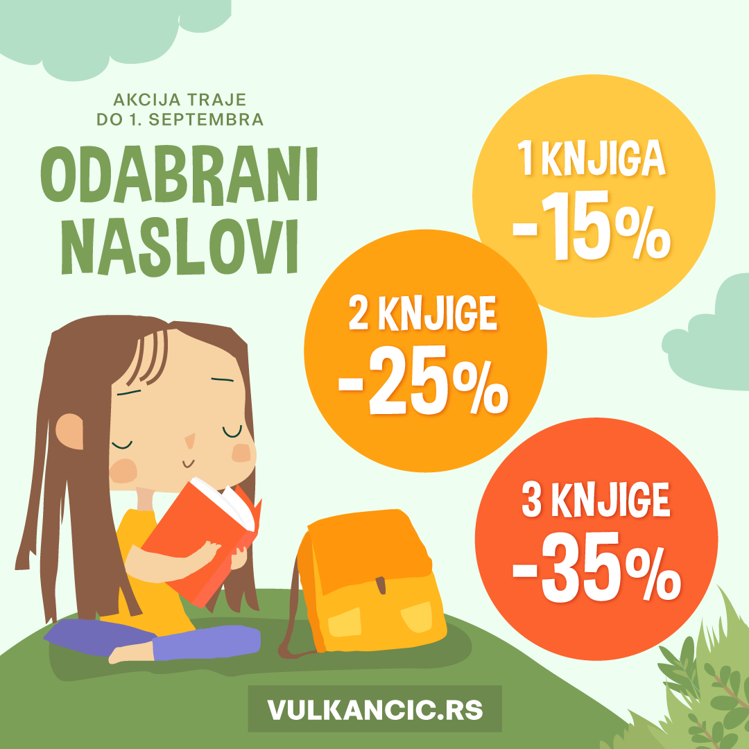 Pripremite svoje školarce za nove avanture! Od 19. avgusta do 1. septembra očekuju vas sjajni popusti na odabrane edukativne knjige za najmlađe. Pri kupovini jedne knjige ostvarujete 15% popusta, za dve knjige očekuje vas popust od 25%, a ukoliko se odlučite za tri naslova sa spiska knjiga obuhvaćenih akcijom, ostvarićete čak 35% popusta.