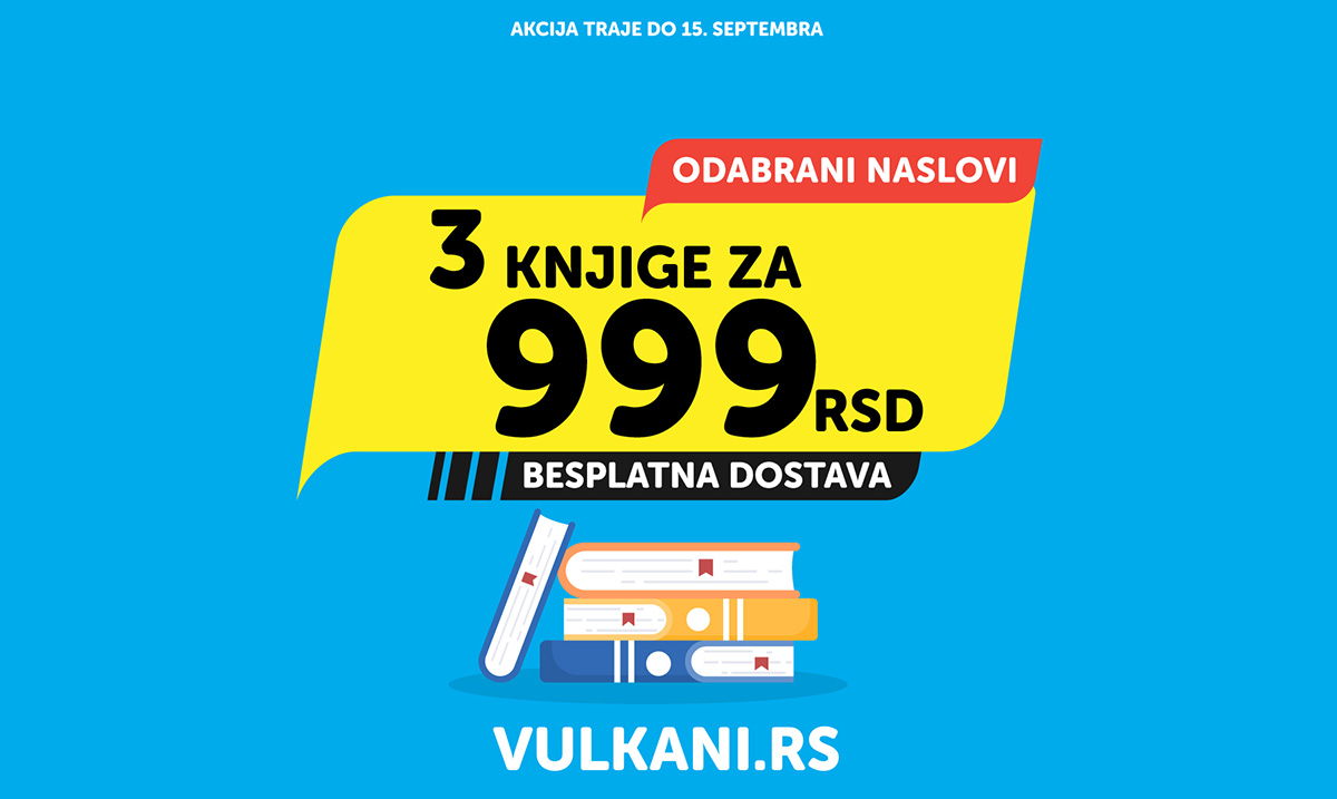 Omiljena akcija Vulkanovih vernih čitalaca 3 knjige za 999 dinara na sajtu vulkani.rs trajaće do 15. septembra. Ukoliko se odlučite za tri knjige sa spiska, platićete ih samo 999 dinara. Dostava je besplatna za sve porudžbine na teritoriji Srbije. Među odabranim bestselerima pronađite pravu knjigu za sebe! Vulkan izdavaštvo izdvojilo je izdanja svih žanrova, zato iskoristite ovu jedinstvenu akcijsku ponudu.