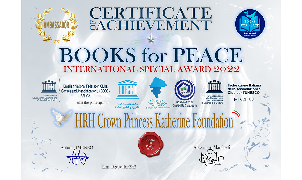 NJ.К.V. Princeza Кatarina je veoma ponosna što je među laureatima koji su dobili međunarodnu nagradu „Кnjige za mir” za 2022. godinu, za svoj rad u korist kulture, solidarnosti i promocije ljudskih prava, društvenih aktivnosti i mira.
