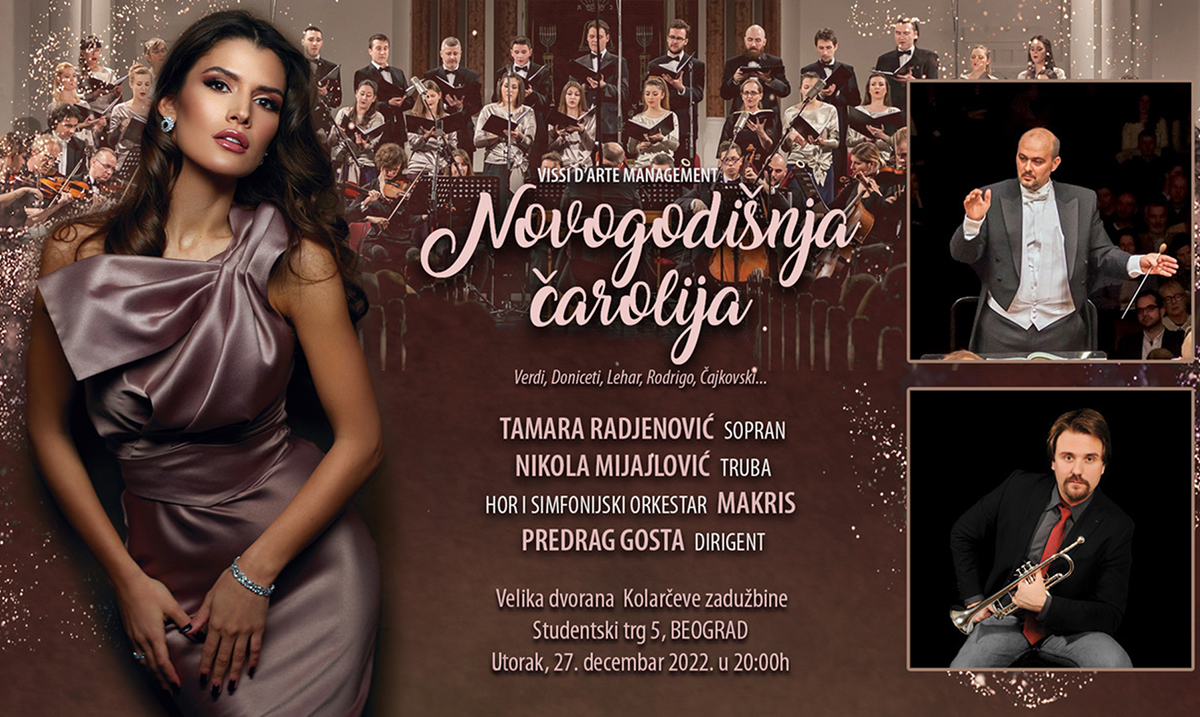 Praznični gala koncert „Novogodišnja čarolija“ biće održan 27. decembra (20:00) Kolarčevoj zadužbini, saopštili su danas organizatori. Solisti sopran Tamara Rađenović i trubač Nikola Mijajlović, u pratnji Hora i Orkestra Makris, pod dirigentskom palicom Predraga Goste, izvešće dela Verdija, Čajkovskog, Šostakoviča, Lehara, Rodriga i Rote, saopšteno je iz Kolarca.