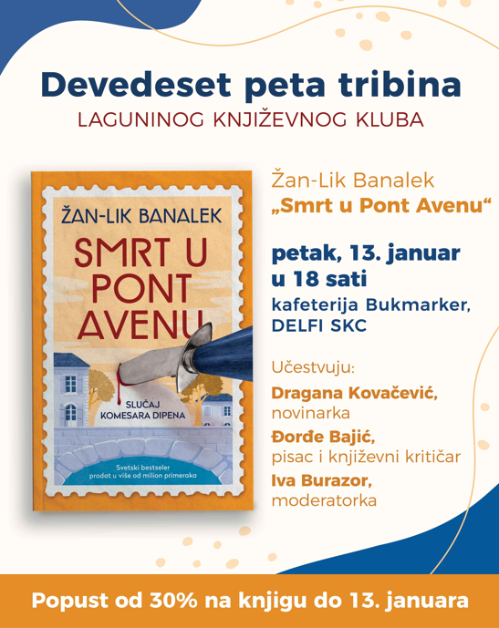 Svetski bestseler prodat u više od milion primeraka „Smrt u Pont Avenu“ Žan-Lika Banaleka biće tema 95. tribine Laguninog književnog kluba, koja će se održati u petak 13. januara od 18 sati u knjižari Delfi SKC. O ovoj knjizi razgovaraće novinarka Dragana Kovačević i Đorđe Bajić, pisac i književni kritičar.