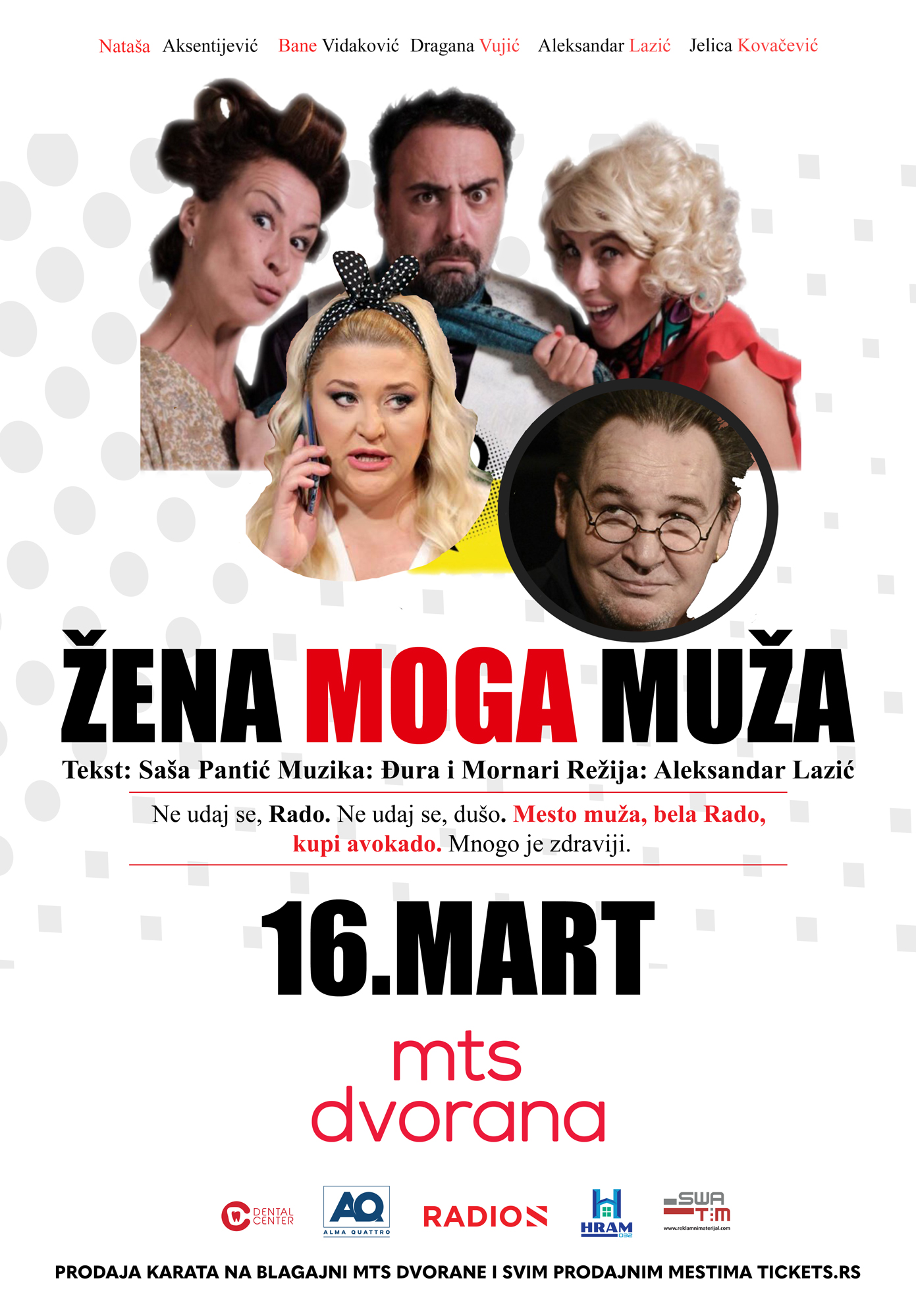 Humoristična predstava „Žena moga muža“ reditelja Aleksandra Lazića, a po tekstu Saše Pantića biće izvedena prvi put „na daskama“ mts Dvorane 16.marta u 20h, praćena uz muziku grupe „Đura i mornari“.