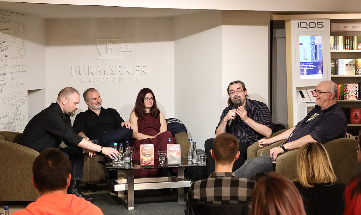 Epic fantasy world star Peter V. Brett from New York and Arthur Clarke Award winner and British science fiction writer Adrian Tchaikovsky mingled with their readers at the Delphi SKC bookstore.Svetska zvezda epske fantastike Piter V. Bret iz Njujorka i