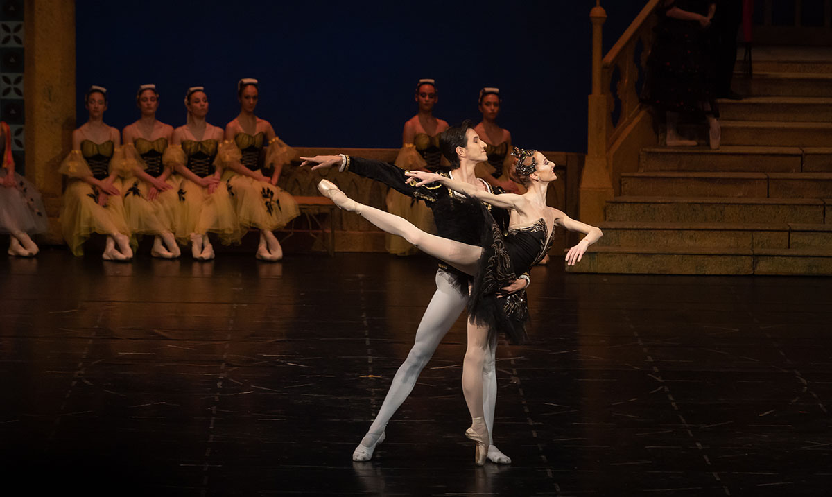 U ovom biseru klasičnog repertoara, u koreografiji Konstantina Kostjukova (prema M. Petipa i L. Ivanovu), priznata bugarska umetnica nastupiće u ulogama Odete/ Odilije, princa Zigfrida dočaraće njen kolega iz Nacionalne opere i baleta Ceco Ivanov, dok je rola grof Rotbarta poverena solisti Baleta Narodnog pozorišta Tomi Križnaru.