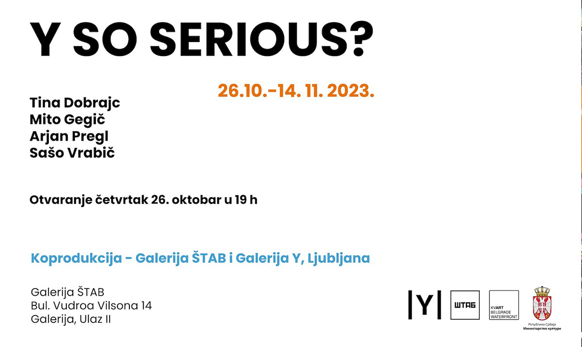 Izložba Y SO SERIOUS? predstavlja deo međunarodnih aktivnosti Galerije ŠTAB i nastavak saradnje sa Galerijom Y iz Ljubljane dajući sveobuhvatan prikaz četiri umetnika srednje generacije, koje Galerija Y zastupa. Gostovanjem u beogradskoj Galeriji ŠTAB svoje radove nastale poslednjih nekoliko godina predstaviće Tina Dobrajc, Mito Gegič, Arjan Pregl i Sašo Vrabič u periodu od 26.oktobra do 14. novembra 2023. godine.