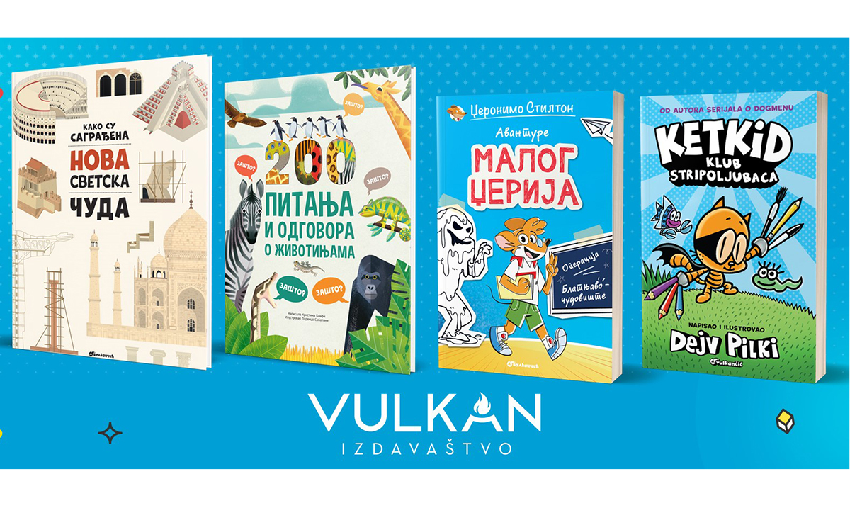 Za najmlađe čitaoce na štandu Vulkančića dostupna je zvučna edicija Glava, ramena, kolena i stopala i druge pesmice, uz koju će mališani naučiti delove ljudskog tela. Moja prva slagalica: Životinje i Brojevi pružiće im zadovoljstvo zabavnog upoznavanja životinja i učenja brojeva, dok će knjige grupe autora 200 pitanja i odgovora o životinjama i Kako su sagrađana nova svetska čuda zadovoljiti nepresušnu znatiželju dečaka i devojčica uzrasta od sedam do devet godina.