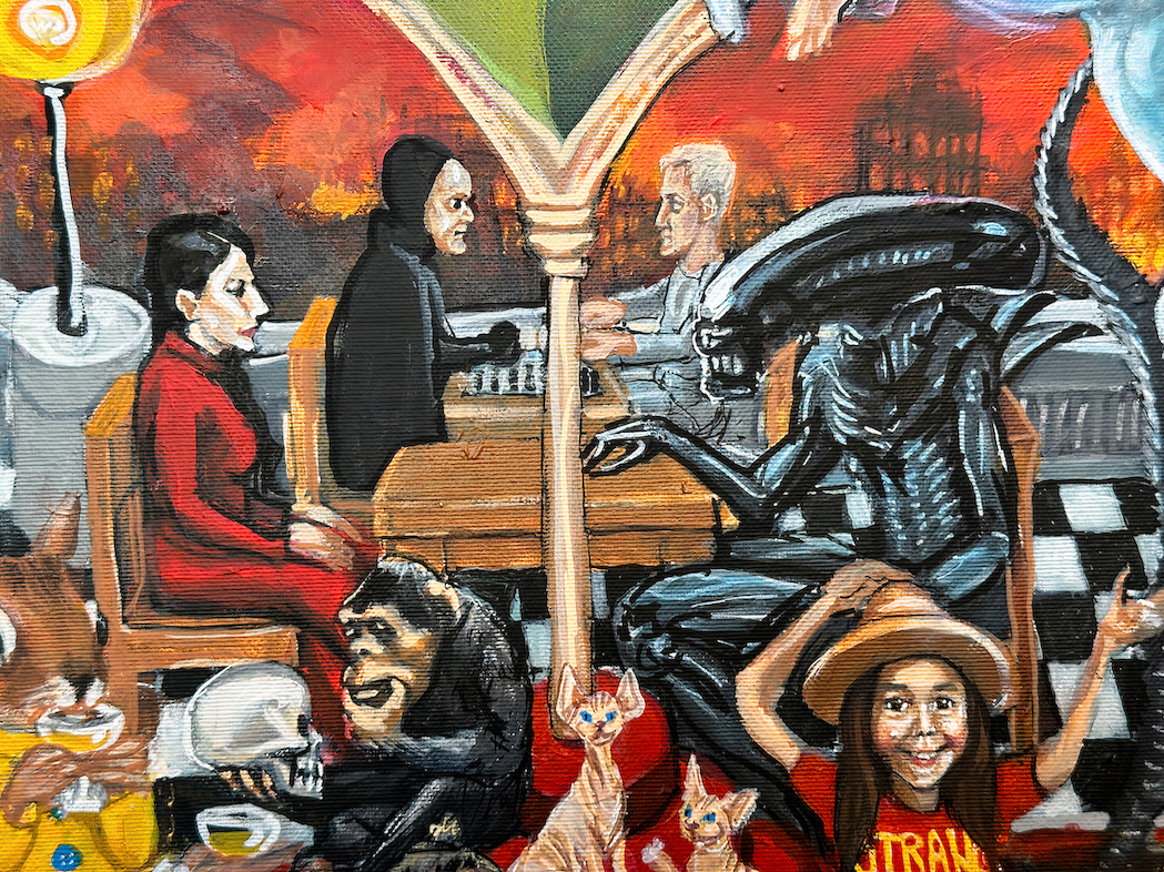 Na izložbi u X Vitamin galeriji biće prikazano jedno monumentalno delo, koje predstavlja istovremeno sublimaciju dosadašnje prakse ali otvara i novo polje u radu Jelene Jelače. Tokom proteklih godinu dana delo nastaje kao refleksija umetnice na aktuelna stanja stvari kojima svedočimo, dok formatom i kompleksnošću  prevazilazi njena dosadašnja ostvarenja, a publici nudi uzbudljivo iskustvo koje se graniči sa transcedentnim. Pregršt karaktera realnih i fantastičnih gusto ispunjava gotovo čitavu površinu platna potvrđujući Jelenin osećaj za dramaturgiju slike. Svoje istorijske reference delo pronalazi u motivu gozbi koje su od srednjeg veka, preko renesanse do primera iz modernog i savremenog doba predstavljale okupljanja oko zajedničkog dobra. Na mnogo načina ovo delo i ova izložba nudi konkretna pitanja na simboličan način.