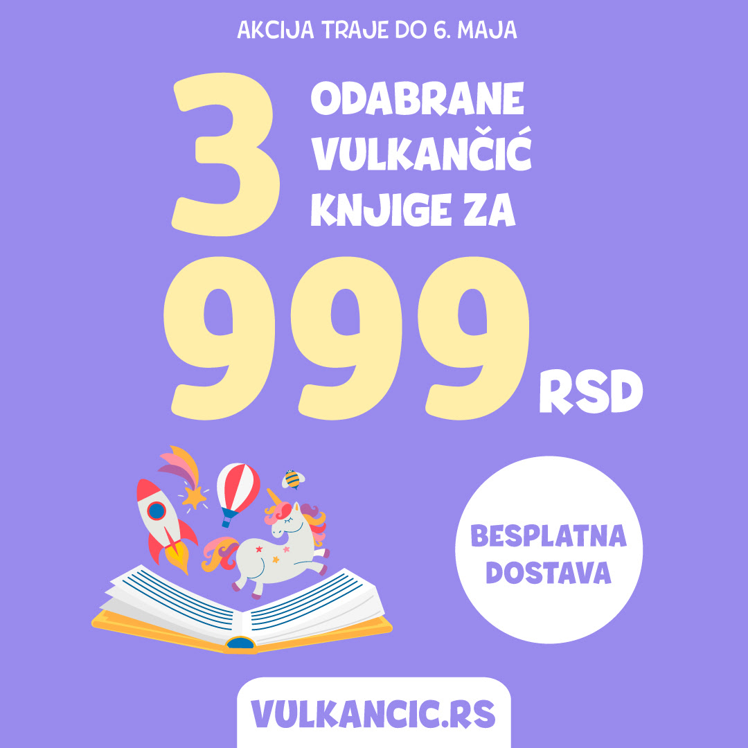 Vulkančić je omogućio novu akciju, zahvaljujući kojoj do 6. maja čitaoci mogu kupiti čak tri knjige po ceni od samo 999 dinara. Na sajtu vulkancic.rs, među odabranim dečjim naslovima nalaze se knjige za sve uzraste – omiljene dečje bajke, interaktivne slikovnice za najmlađe, fantastične mozgalice… Kupovinom knjiga za decu putem sajta vulkancic.rs čitaoci ostvaruju i besplatnu isporuku na teritoriji cele Srbije.