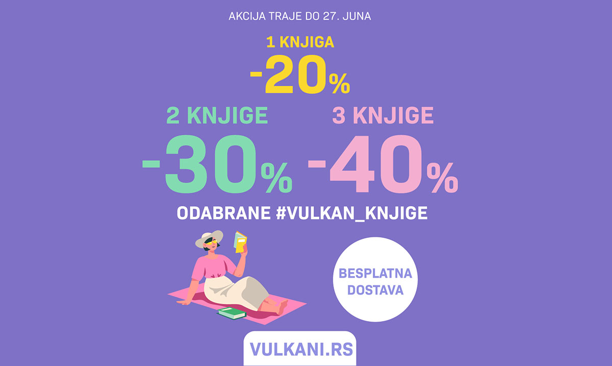 Nova akcija donosi sjajne popuste! Do 27. juna na sajtu vulkani.rs odabrane Vulkan knjige biće na popustu do 40%. Ukoliko se odlučite za jedan naslov, obračunava se 20% popusta, za dve kupljene knjige 30%, a za tri odabrane knjige čak 40% popusta. Dostava akcijskih naslova na teritoriji Srbije je besplatna.