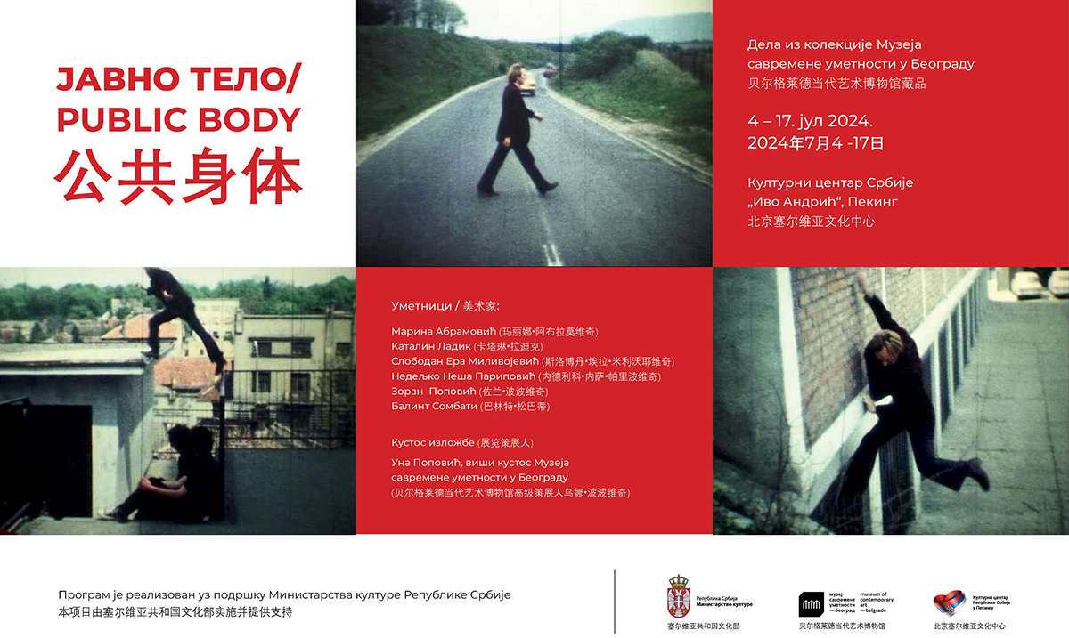 U četvrtak 4. jula u Kulturnom centru Srbije „Ivo Andrić“ u Pekingu, Muzej savremene umetnosti otvara izložbu „Javno telo“ s delima iz svoje kolekcije. Ova izložba fokusira se na prezentaciju performans akcija umetnika nove umetničke prakse koja se razvijala krajem šezdesetih i tokom sedamdesetih godina u Srbiji, paralelno uz svetske tokove konceptualne umetnosti. Biće predstavljeni radovi iz kolekcije MSU umetnica Marine Abramović i Katalin Ladik, i umetnika Slobodana Ere Milivojevića, Nedeljka Neše Paripovića, Zorana Popovića i Balinta Sombatija. Autorka izložbe je Una Popović, viša kustoskinja Muzeja savremene umetnosti u Beogradu.
