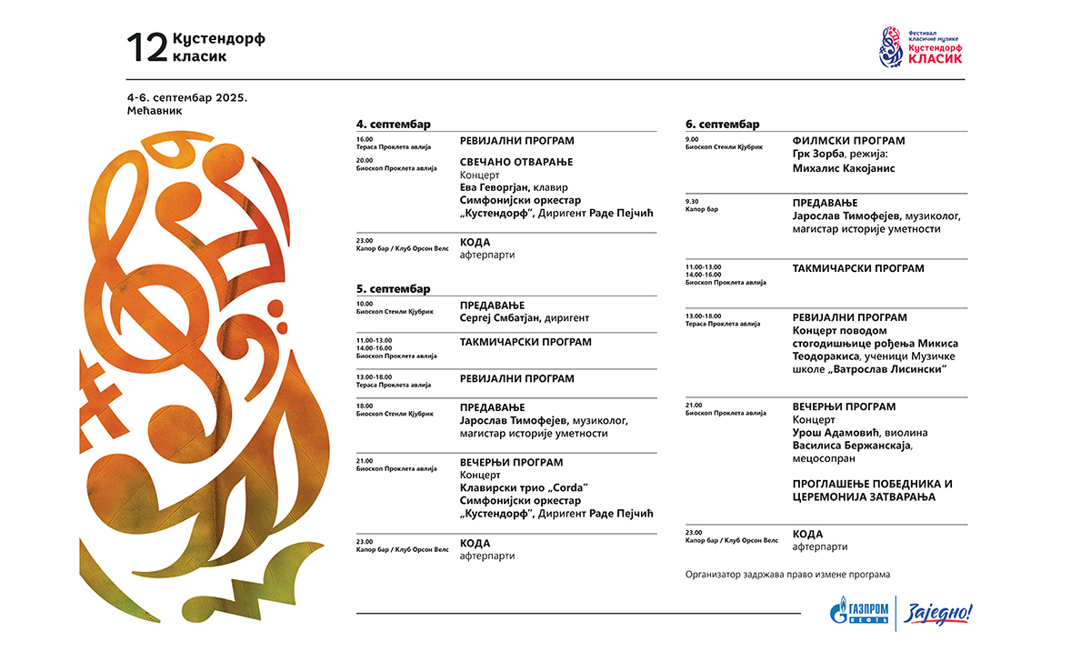 Festival klasične muzike „Kustendorf klasik“ trajaće tri dana i održaće se od 4. do 6. septembra 2025. godine, u etnoselu Mećavnik, Mokra Gora. Festival „Kustendorf klasik“ održava se 12. put i zajednički je projekat renomiranog srpskog režisera Emira Kusturice i kompanije „Gasprom njeft“.