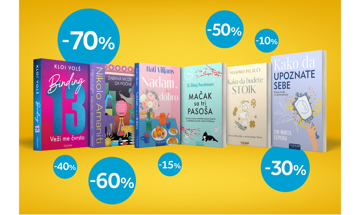Vulkanov sajam knjiga tek se zahuktava, a svim ljubiteljima knjiga omogućava da uz besplatnu dostavu za sve akcijske naslove naručene na portalima vulkani.rs i knjizare-vulkan.rs i redovan popust od 15 % onlajn i u knjižarama Vulkan, ostvare sajamski popust od 10%, i još 10% ako kupe tri ili više knjiga! Pored toga, 30 najčitanijih naslova i svi noviteti iz beletristike i dečje književnosti mogu se nabaviti s popustom od 30%, a za pojedine naslove popusti idu čak i do 70%!