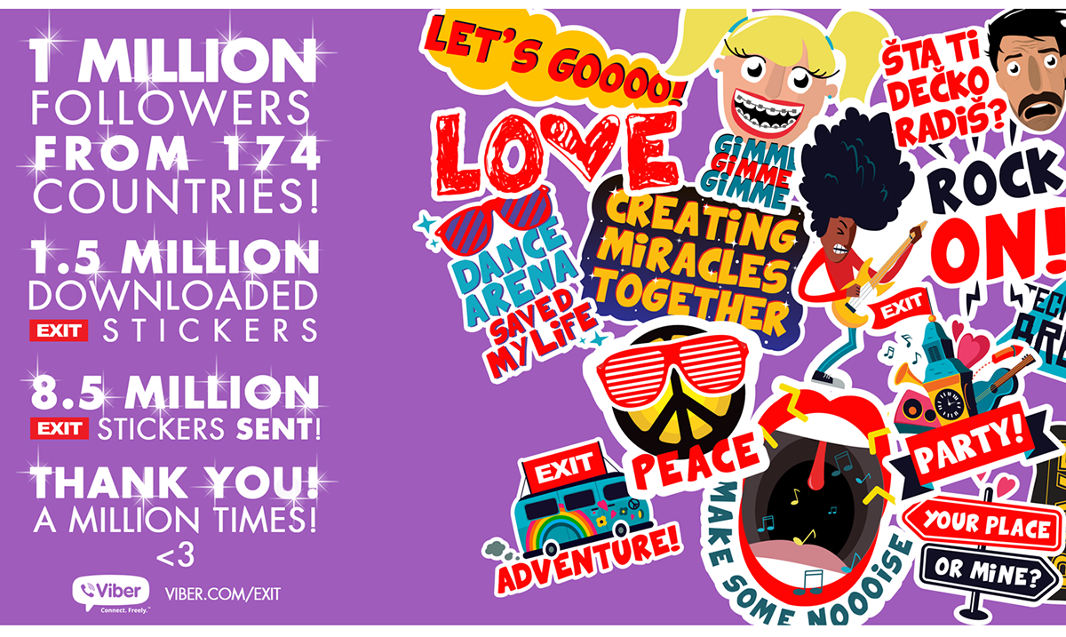 EXIT je ove godine objavio i zvanični paket Viber stikera na srpskom, engleskom i ruskom jeziku, delo dizajnerke Tanje Zajceve iz Moskve, pobednice globalnog kreativnog konkursa „Moja EXIT avantura“. Stikeri su u samo tri meseca preuzeti 1,5 miliona puta, a prosleđeni 8,5 miliona puta od strane korisnika. EXIT i Sea Dance su tako postali prvi među vodećim svetskim festivalima koji imaju svoj paket stikera na Viberu; obožavaoci koji su poslali najviše EXIT stikera dolaze iz Srbije i država bivše Jugoslavije, ali i susednih zemalja poput Mađarske i Bugarske. U stopu ih prate korisnici Vibera iz Rusije, Velike Britanije, Ukrajine, Nemačke, Francuske i Austrije, a na listi zemalja se nalaze i egzotične destinacije poput Solomonskih ostrva, Barbadosa i Fidžija! EXIT će idućeg proleća obradovati stotine miliona korisnika Vibera širom sveta novim stikerima u duhu teme narednog festivalskog izdanja – EXIT Summer of Love 2017.
