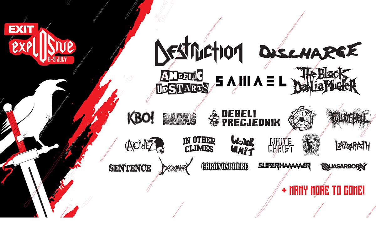 EXIT festival dobio je nova, žestoka pojačanja za ovogodišnji festival koji će se održati od 6. do 9. jula na Petrovaradinskoj tvrđavi. Spoj melodičnog i tvrdog zvuka čuće se sa treće najveće bine festivala, Fusiona, jer stiže legendarni sastav The Damned koji će doneti svoju prepoznatljivu punk atmosferu, a čuvena bina EXIT festivala posvećena ektremnom zvuku, Explosive, i ove godine biće epicentar zemljotresa koji će izazvati najnovija objavljena imena metal, punk i hardcore scene! Furiozni line-up predvodiće legendarni pankeri Angelic Upstarts koji dolaze u Srbiju nakon 32 godine! Njima se pridružuje i kultno ime ekstremne industrial dark metal scene, švajcarski Samael. Oni će predvoditi eksplozivni program ove bine pored već najavljenih sastava The Black Dahlia Murder, Discharge i Destruction.