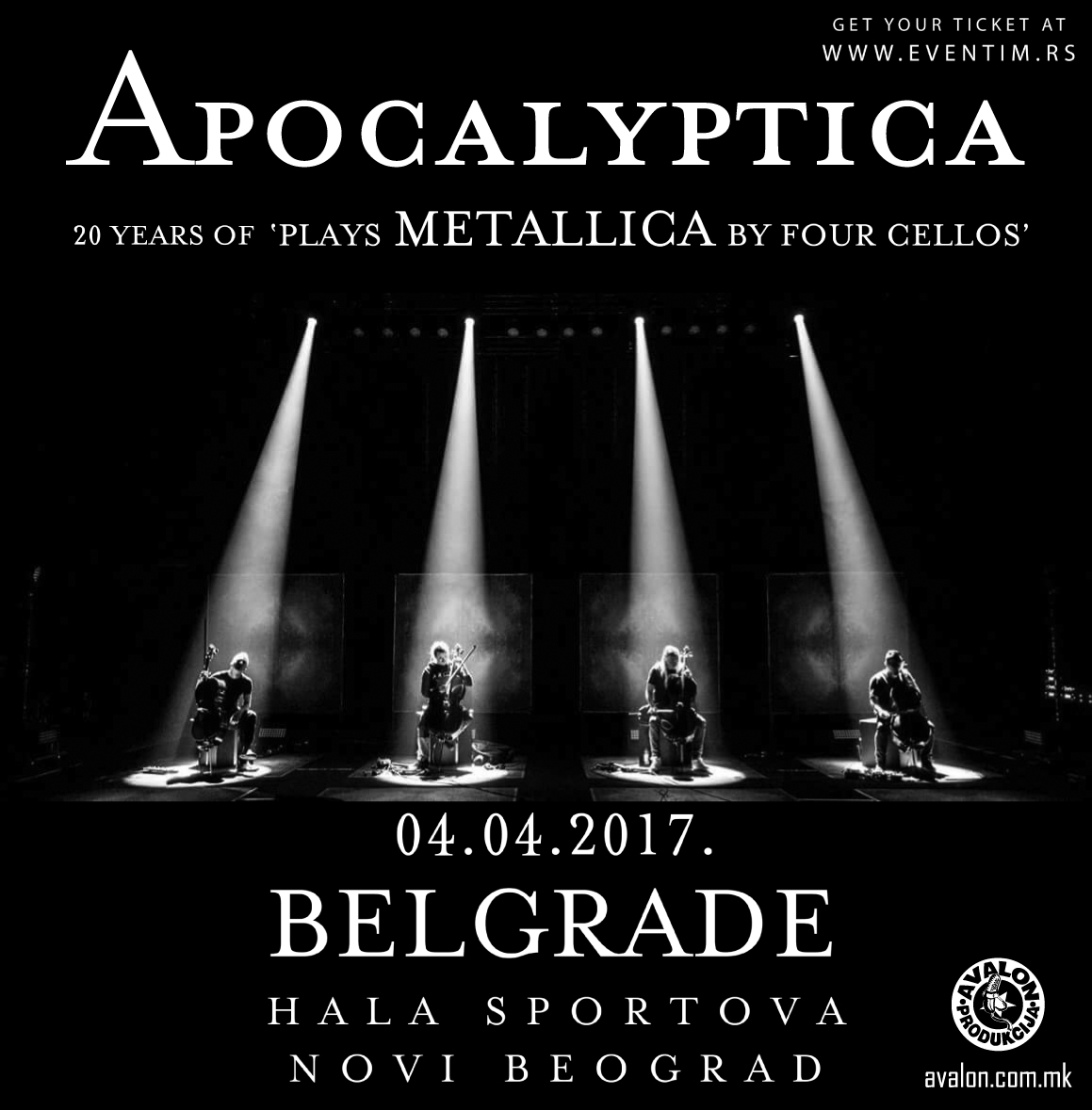 Apocalyptica proslavlja 20 godina od izlaska albuma „Apocalyptica Plays Metallica By Four Cellos“ svirajući najveće hitove grupe Metallica. Ono što je posebna poslastica za naše fanove je činjenica da će koncert trajati oko dva i po sata, gde će moći da se čuju najveći hitovi Metallice – ’’One’’, ’’Battery’’, ’’Master Of Puppets’’, ’’Fade To Black’’, ’’The Unforgiven’’, ’’Nothing Else Matters’’ i mnoge druge pesme koje su proslavile Apocalypticu.