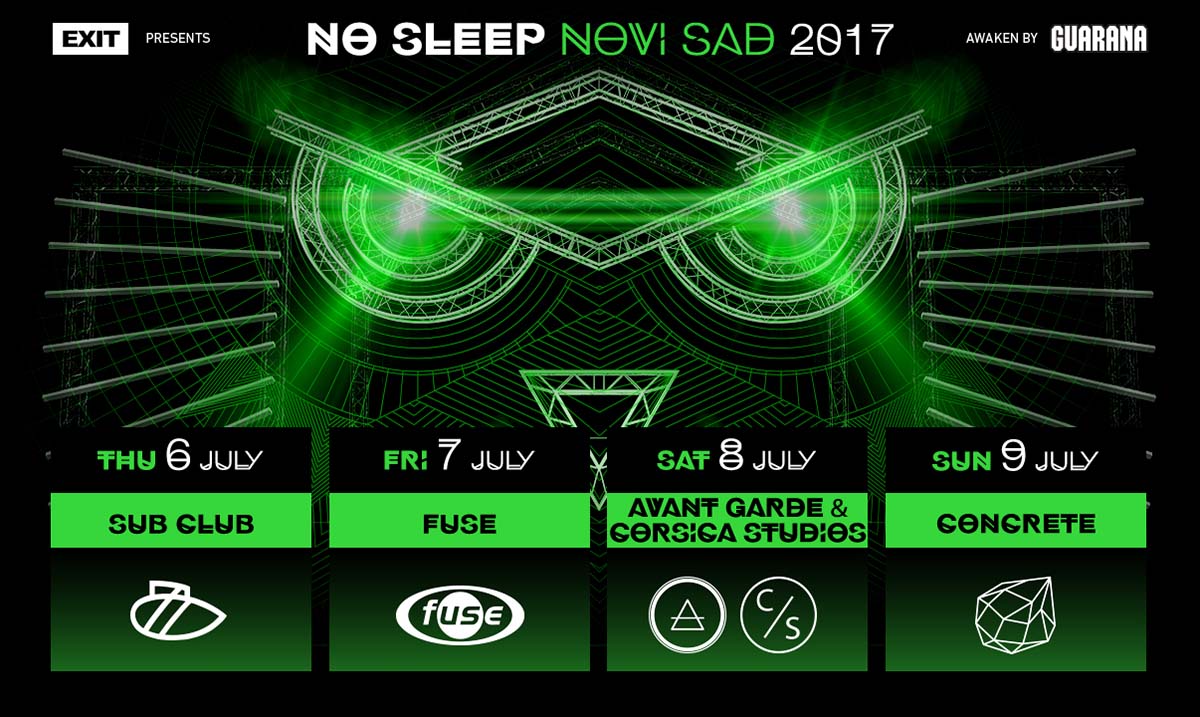 Famozna No Sleep Novi Sad bina i ove godine će svake noći na EXIT festivalu publiku uvoditi u drugi svetski klub! Magiju koju određena kultna mesta imaju ne čine ni cigle ni malter, već poseban duh, bogata istorija i program koji se za ovu godinu pažljivo spremao još od početka prošle jeseni. Ovu nepogrešivu formulu prošlog leta su i u praksi pokazali trodecenijski simbol Barselone, klub Nitsa, berlinska tehno institucija Tresor, te čuveni pariski klub Concrete čija je noć bila apsolutno antologijska pred veliko finale koje su združeno izveli bečki Grelle Forelle i beogradska tehno katedrala Drugstore. Ove godine, u dobro poznatom rovu iza Arene, od 6. do 9. jula, na spisku smo za četiri nove noći bez sna!