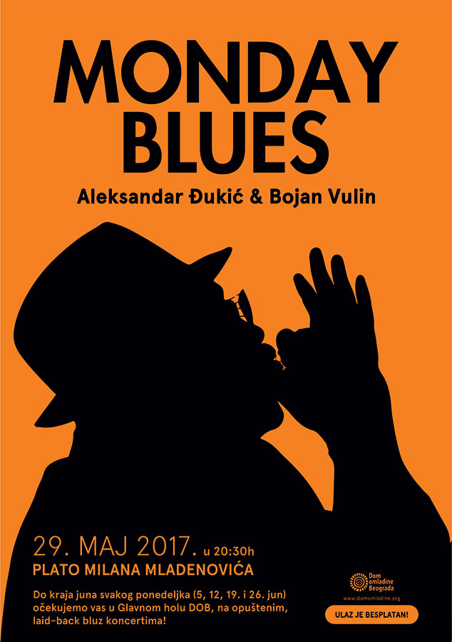 Prvi nastup Monday Blues dvojca, 29. maja od 20:30h biće održan na Platou Milana Mladenovića ispred Doma omladine Beograda, a do kraja juna svakog ponedeljka (5, 12, 19. i 26. jun) očekujemo vas u Glavnom holu DOB! Ulaz je besplatan!
