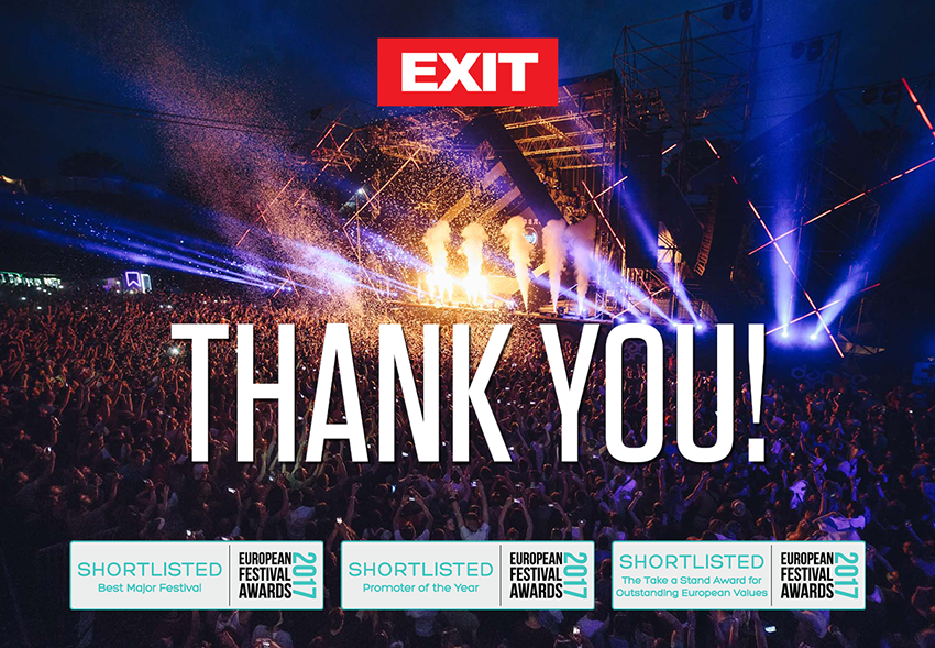 Na zvaničnom izboru za najbolje festivale u Evropi (European Festival Awards) na kojem učestvuje vrtoglavih 350 festivala iz više od 35 zemalja starog kontinenta, sva četiri festivala u organizaciji EXIT tima izglasani su među deset najboljih, svaki u svojoj kategoriji! EXIT je glasovima publike i devetu godinu uzastopno izabran u 10 najboljih festivala Evrope i to u glavnoj kategoriji za „Najbolji veliki festival“ zajedno sa ostalim gigantima kao što su belgijski Tommorowland, holandski Lowlands, nemački Wacken Open Air ili susedni Sziget u Mađarskoj.