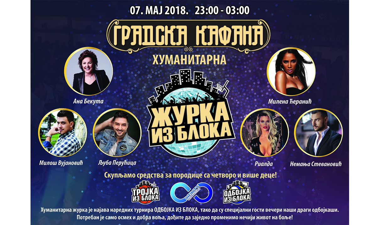 Trojka iz bloka, Gradska kafana i Infinity Production vas pozivaju na veliku humanitarnu Žurku iz bloka koje će se održati u ponedeljak 7. maja od 23 časa u Gradskoj kafani. Dobro raspoloženje i dobra volja da dođete je sve što vam je potrebno – ulaz je besplatan, a celo veče prikupljaćemo donacije za socijalno ugrožene porodice sa 4 i više dece. Veliki spektakl je spreman, a posetioce očekuje bogat program.