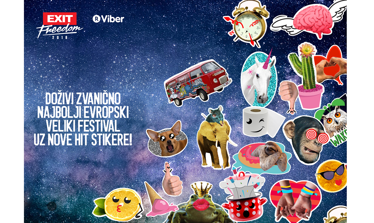 Za svoj osamnaesti rođendan koji se tradicionalno obeležava 29. juna, već treću godinu zaredom EXIT poklanja besplatne Viber stikere u saradnji sa najpopularnijom komunikacijskom aplikacijom u regionu! EXIT, kao prvi festival u svetu koji je izbacio svoje Viber stikere, danas se po broju od preko 1,1 milion fanova na ovoj komunikacijskoj platformi, nalazi u društvu najvećih svetskih brendova kao što su FC Barcelona ili Coca-Cola, a u našem regionu je bez premca u odnosu na druge popularne brendove kao što su sportski klubovi, telekomunikacijski provajderi i drugi. Ove godine, stikera je više nego ikad pre, pa će čak 34 neodoljive kombinacije fotografija i ilustracija biti dostupni za preko milijardu Viber korisnika širom sveta! Da će ove godine EXIT stikeri biti još popularniji nego pre, najbolje govore statistike iz prethodnih godina, kada je preko tri miliona korisnika iz čak 174 zemlje sveta preuzelo sve dosadašnje stikere i poslalo ih preko 30 miliona puta!