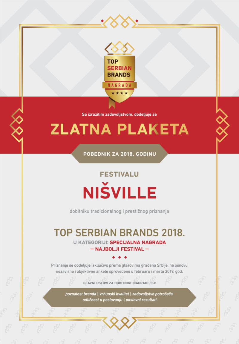 Objektivnost i nezavisnost nagrade svakako daje dodatnu pozitivnu dimenziju, te se ovom prilikom Nišville jazz festival zahvaljuje svim građanima Srbije koji su glasali za Nišville kao prepoznatljiv kulturni brend i dodelili mu titulu najboljeg festivala u Srbiji u 2018.godini.