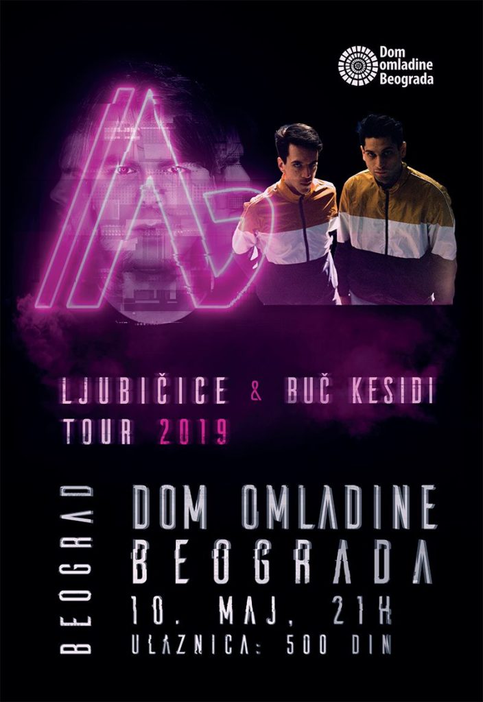 Grupa Ljubičice, jedan od najkarakterističnijih bendova novije alternativne scene, donosi svoj jedinstveni rokenrol/elektro bluz zvuk, i za 10. maj priprema veliku koncertnu promociju novog izdanja, Žigosani u reketu, sa muzikom za istoimenu seriju. U beogradski Dom omladine stižu u samom finalu svoje Prolećne turneje, u društvu svojih prijatelja i sugrađana, benda Buč Kesidi. Za koncert u DOB-u oba benda najavljuju bombastičan repertoar i odličnu žurku!