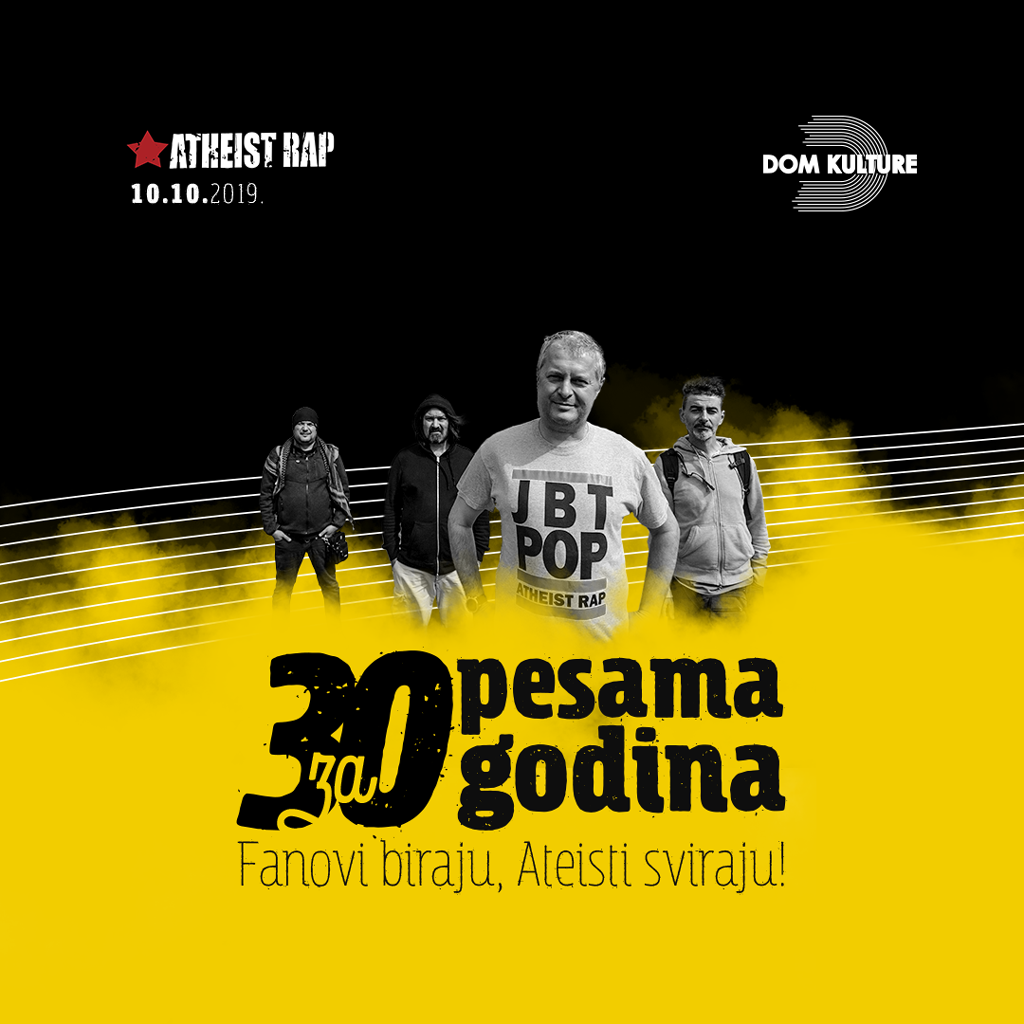Povodom jubileja, 30 godina rada benda, dugoočekivani i veoma poseban klupski koncert sastava Atheist Rap biće održan 10. oktobra u Domu kulture pod nazivom 30 PESAMA ZA 30 GODINA BENDA! FANOVI BIRAJU, ATEISTI SVIRAJU.
