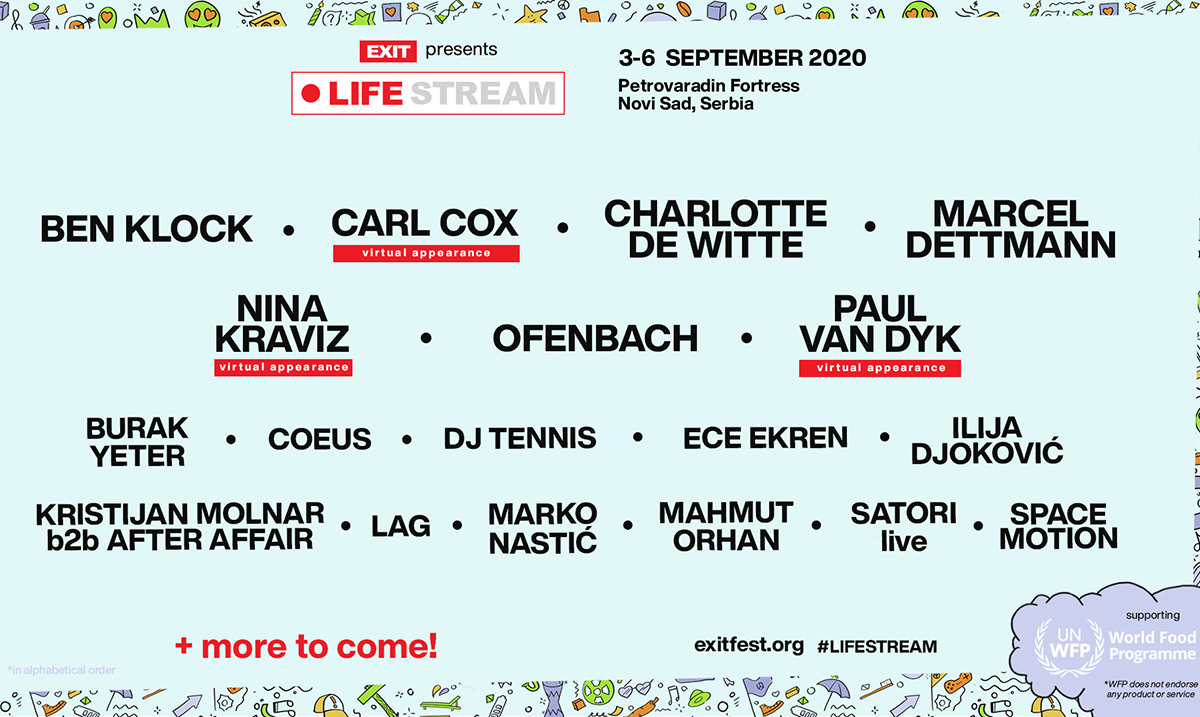 Life Stream donosi udarnu prvu postavu globalnih i regionalnih muzičkih zvezda, impresivan spisak izvođača koji će svojim ekskluzivnim nastupima usmeriti pažnju planete na projekat koji EXIT realizuje u saradnji sa Svetskim programom za hranu Ujedinjenih nacija, najvećom humanitarnom organizacijom na svetu!