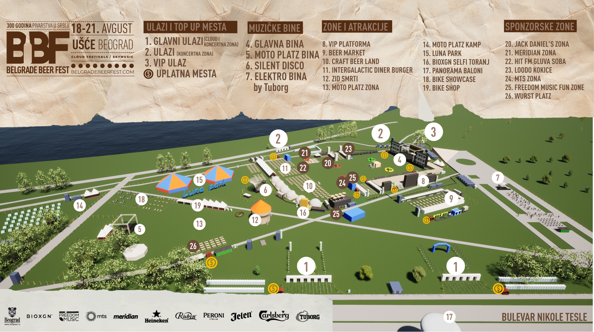 druge. Organizatori su najavili produkcijski spektakl sa bezmalo 800 metara kvadratnih LED ekrana, najsavremenijim LEO ozvučenjem, te brojnim sadržajima kao što su Beer market i Craft Beer Land sa preko 300 etiketa piva, Moto Platz (sa osebnom binom i muzičkim programom, zidom smrti, kampom, izložbom custom i oldtajmer motora, tattoo studiom itd), Intergalactic Diner Foodland, Silent disco bina, Luna park, panorama baloni, Bioxgn selfi toranj visok 17m sa kog će posetioci moći da naprave najbolji selfi ikada, Elektro zona by Tuborg…