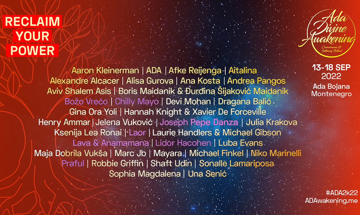 Ovogodišnje izdanje Ada Divine Awakening festivala biće održano u magičnom okruženju Ade Bojane, od 13. do 18. septembra, i okupiće preko 40 vodećih svetskih edukatora, koučeva, iscelitelja i terapeuta iz oblasti partnerstva, svesnosti, seksualnosti i ličnog razvoja. ADA je prvi festival svesnosti i intimnosti na ovim prostorima, a ovogodišnja zvezda vodilja učesnika je „Povrati svoju moć„.