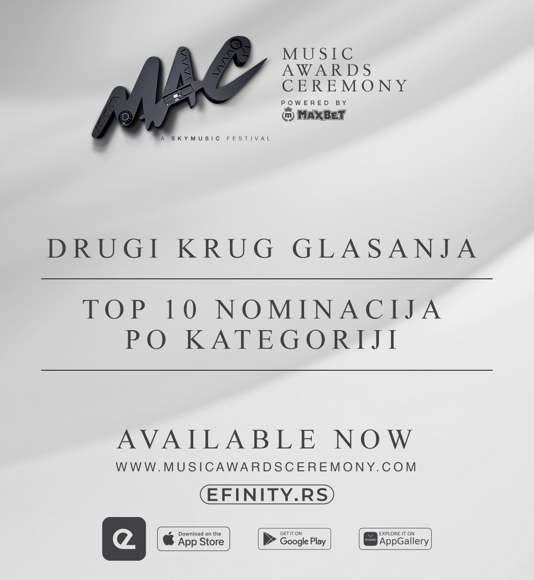 Music Awards Ceremony (MAC) powered by MaxBet održaće se 25. i 26. januara u organizaciji Skymusic-a, a u Štark Areni nas očekuju najveće muzičke zvezde iz Srbije, Hrvatske, Bosne i Hercegovine, Crne Gore, Makedonije i Slovenije. Za nezaboravan šou, pored spektakularnih nastupa i najsavremenije audio-vizuelne produkcije, pobrinuće se i šarmantni voditeljski parovi – Jelena Gavrilović i Tonči Huljić biće domaćini prve večeri ceremonije, dok će već sledećeg dana tu ulogu preuzeti ikone novog muzičkog talasa – Mimi Mercedez i Voyage!