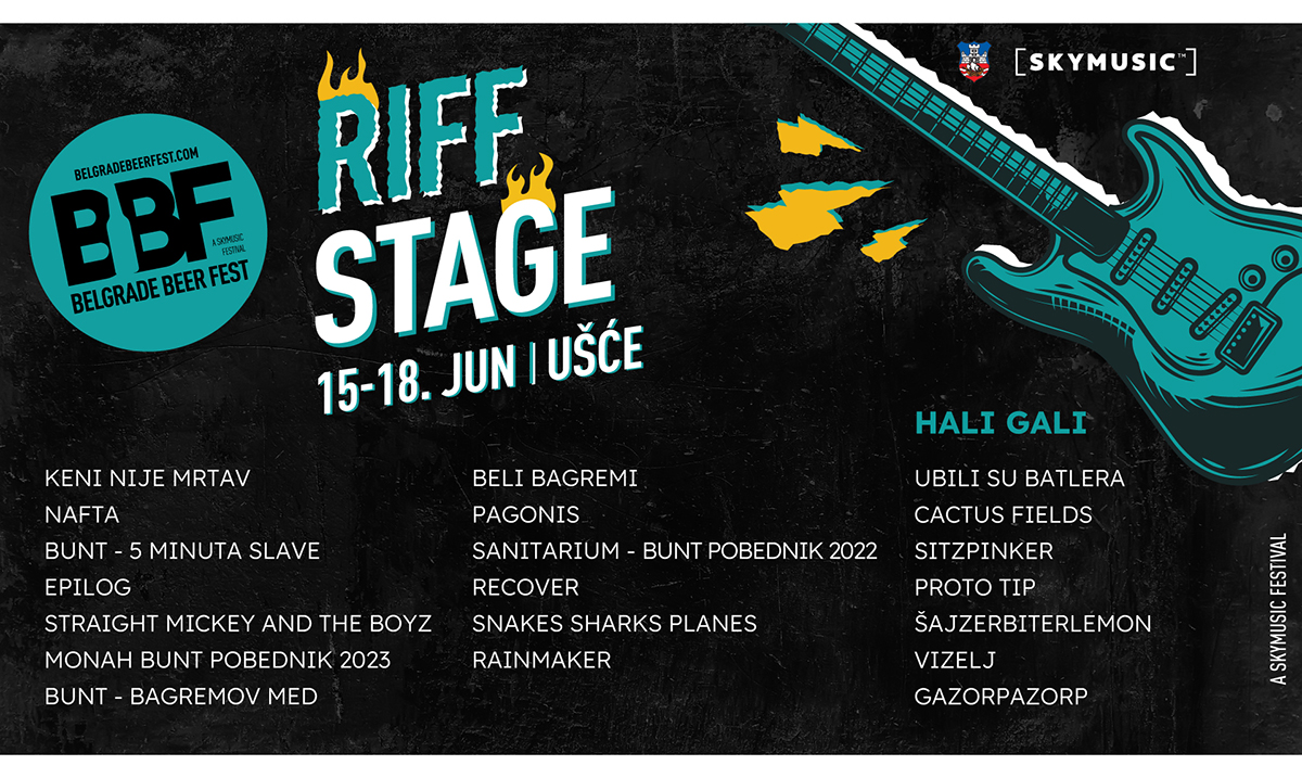 Riff stage će tokom četiri festivalska dana biti pravi epicentar energije, strasti i nezaboravnog rok zvuka, budući da nas očekuju nastupi bendova Straight Mickey and the Boyz, Keni nije mrtav, Snakes Sharks Planes, Nafta, Beli bagremi, Epilog, 5 minuta slave, Rainmaker, Pagonis, Sanitarium, Recover, dok će čitav jedan dan biti rezervisan za festival u festivalu, popularni Hali Gali.