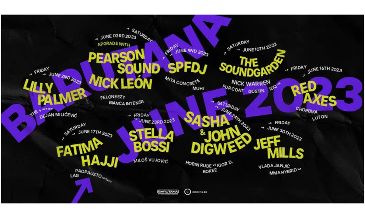 Prvog vikenda juna na programu Barutane su nastup autentične predstavnice evropskog andergraunda Lilly Palmer i novo izdanje Apgrade serijala uz Pearsona Sounda i Nicka Leóna. Do kraja meseca posetioce očekuju nastupi berlinske techno DJ-ice SPFDJ, The Soundgarden showcase sa Nickom Warrenom i Fur Coatom, dvojca Red Axes, Fatime Hajji, Stelle Bossi, legendi elektronske muzike Sashe i Johna Digweeda, kao i gostovanje jednog od najvećih, najpoznatijih i najuticajnijih DJ-eva i producenata svih vremena Jeffa Millsa.
