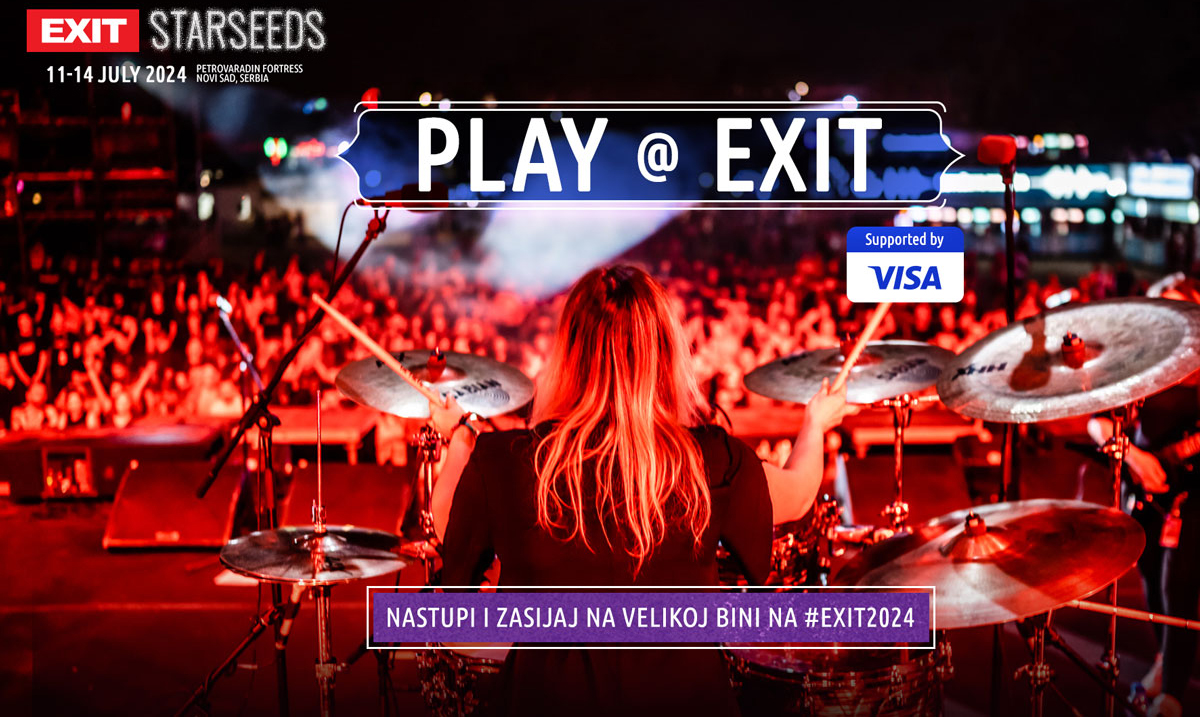EXIT festival i kompanija Visa i ove godine raspisuju tradicionalni Play @ EXIT konkurs, u okviru kog će ukupno šest izabranih autorskih bendova ili izvođača imati priliku da nastupe na kultnim Visa Fusion ili Explosive binama na ovogodišnjem izdanju festivala od 11. do 14. jula, a prijave su otvorene do 29. maja!