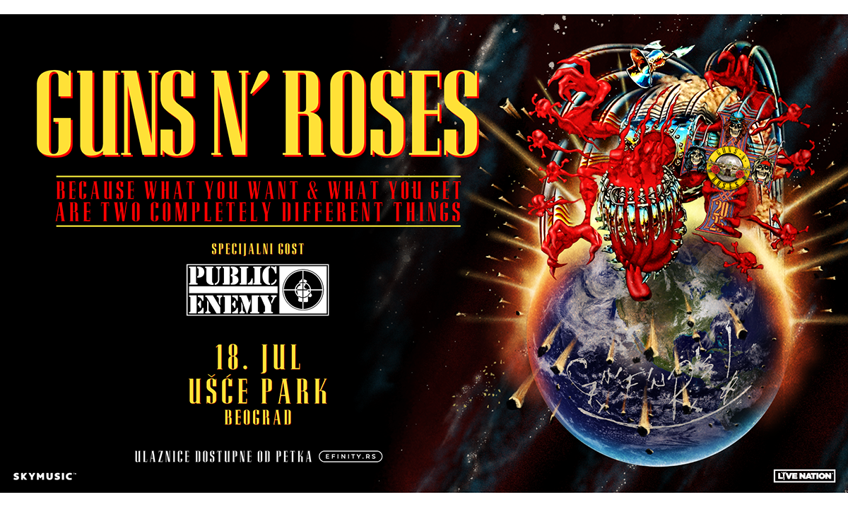 Bend dolazi u sastavu Axl Rose (vokal, klavir), Slash (gitara), Duff McKagan (bas), Dizzy Reed (klavijature), Richard Fortus (ritam gitara), Frank Ferrer (bubnjevi) i Melissa Reese (klavijature), a turneja pod nazivom „Because what you want &what you get are two completely different things“ nosi još jedan kuriozitet – kultni hip – hop bend Public Enemy najavljen je kao specijalni gost!