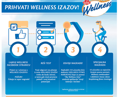 Sve što treba da uradite jeste da kupite bilo koja tri različita pakovanja Wellness keksa – svoje omiljene užine i uz pomoć bar kodova na Wellness Facebook strani rešite test i osvojite super nagradu – Wellness fitness narukvicu koja uz pomoć aplikacije „My Wellness Time“ meri kalorije i korake!
