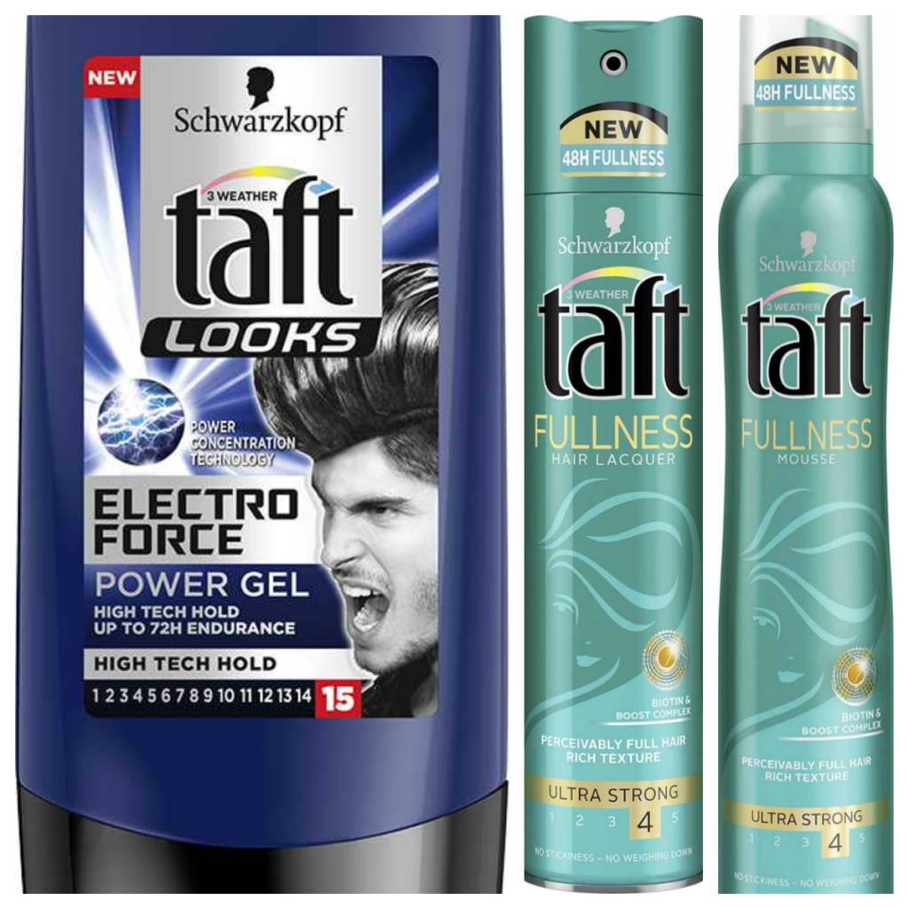 Kako bi se podjednak tretman pružio i snažnijem polu, Taft ELECTRO FORCE će biti savršen partner velikog broja muškaraca tokom svakodnevnog oblikovanja frizure, ispunjavajući im san o idealnom stilizovanju kose. ELECTRO FORCE linija nudi rešenje za zahtevne muškarce u obliku dva nova Taft proizvoda sa izuzetno jakim učinkom. ELECTRO FORCE gel, jačine 15, sa tehnologijom koncentrovane snage i specijalnom kombinacijom polimera garantuje izuzetno jako i čvrsto držanje, dok ELECTRO FORCE Plasma Gum sa ultra lakom teksturom omogućuje jednostavno oblikovanje kose.