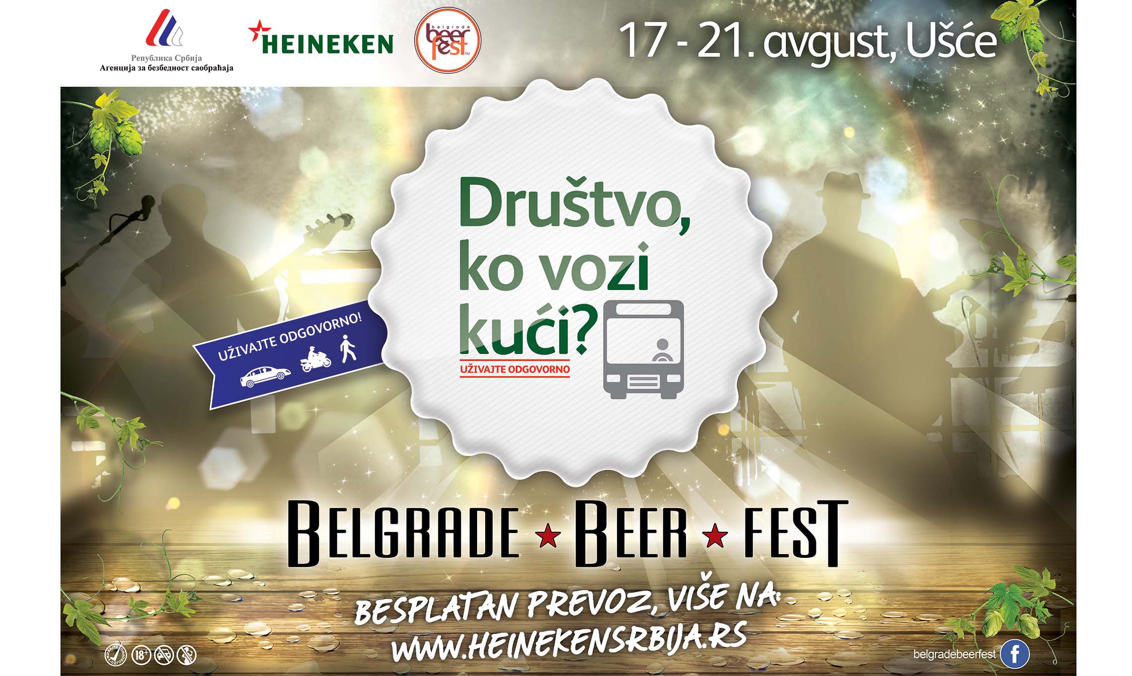 Akcija „Društvo, ko vozi kući?“, koju kompanija HEINEKEN Srbija već četvrtu godinu organizuje u okviru Belgrade Beer Fest-a, proširena je na teritoriju cele Srbije. Ove godine akciji se priključila i Agencija za bezbednost saobraćaja sa ciljem povećanja bezbednosti posetilaca, kako bi uživali odgovorno i bezbedno se vratili kući. Odgovorna konzumacija biće promovisana i u okviru Safe Zone, na samom festivalu, gde će posetioci imati priliku da se zabave zanimjivim edukativnim igrama i dobiju poklone iznenađenja. Prvi put ove godine, pored besplatnog prevoza do četiri ključne tačke u Beogradu, obezbeđeni su bezbedni dolazak i povratak i za posetioce iz Novog Sada, Niša i Kragujevca.