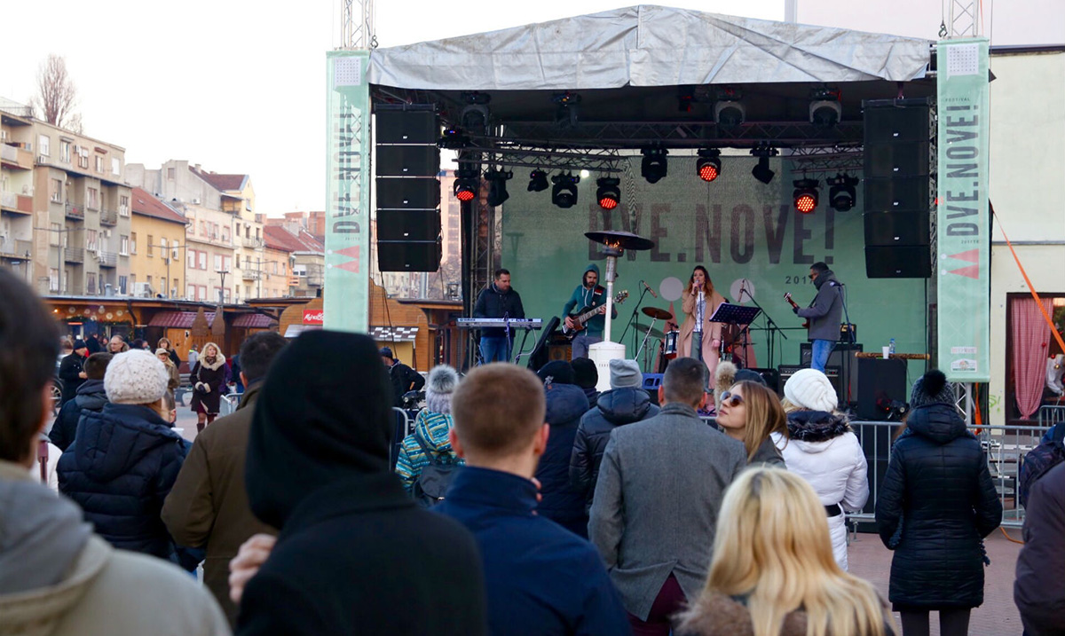 Kako festival Dve.Nove podrazumeva slavlje na 4 bine uz više od 100 izvođača, posetioci su uživali u najraznovrsnijem programu do sada. Na Trgu republike novogodišnja žurka počela je već od 10 časova, kada je publika plesala uz listu koju je pripremio Dj Dirty, zatim je usledio nastup sastava Swing Time i Ane Perišić, a za novogodišnju noć dobro su zagrejali prisutne Vukašin Vojvodić i Drum’n’zez. Odbrojavanje do ponoći i horsko pevanje čuvenih hitova usledilo je na nastupu benda Irie FM.  Na ovoj bini utiske sa novogodišnje noći sabiraćemo večeras već od 17 časova uz Vukašina Vojvodića, novosadski ska bend Josipa A Lisac, Branimira i neprijatelje, DJ Iliju Rudovića, a program ove bine zatvoriće bend Zemlja gruva. Partneri koji su podržali program na Trgu Republike su JKP Tržnica i manifestacija Artecomarket.