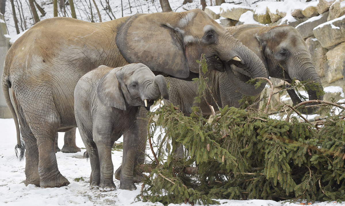 Tirolska omorika visoka 18 metara i stara 58 godina koja je krasila Božićni i Novogodišnji vašar ispred dvorca Šenbrun i ove godine je poslužila kao zakuska slonovima u Bečkom zoološkom vrtu. Slonče Ikva staro tri godine, njena mama Tonga, njena polusestra Mongu i slonice Drumbo i Numbi obradovale su se svežem, zelenom obroku na jelovniku.