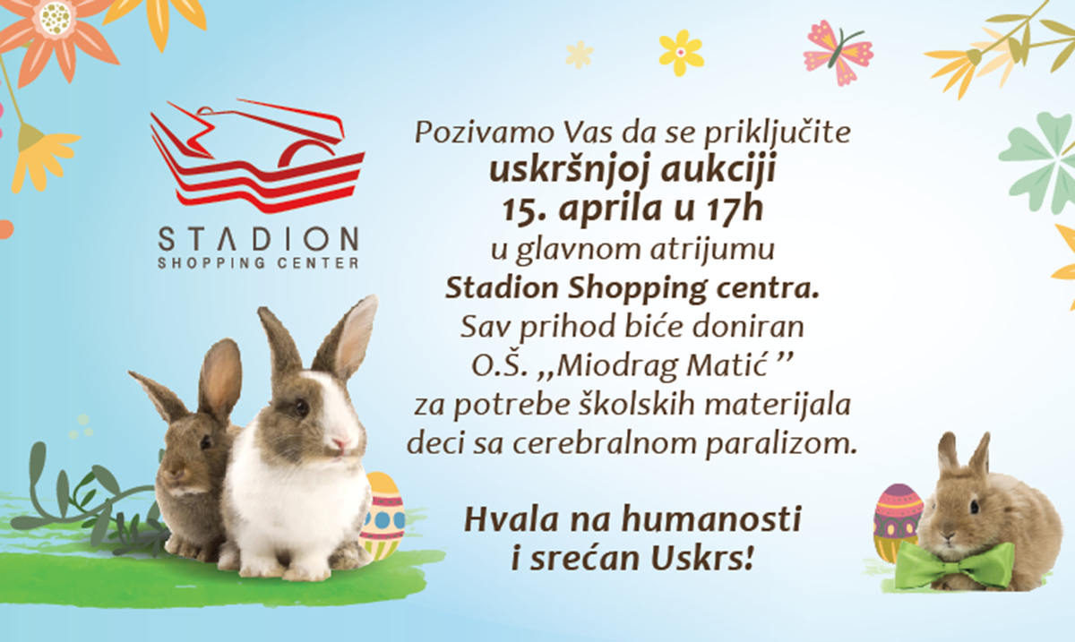 Narednog vikenda, 14. i 15.4.2017., Stadion Shopping Centar od 10h otvara svoja vrata za sve porodice koje žele da jedan od najvećih praznika, Uskrs, pripreme u društvu. Povod porodičnog farbanja jaja u centru je OŠ „Miodrag Matić“ – jedina školi na teritoriji Republike Srbije za decu sa cerebralnom paralizom.